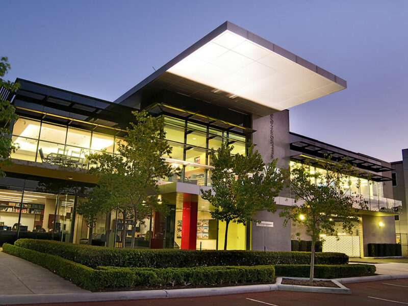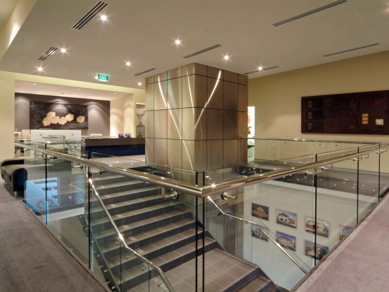The new offices feature polished precast concrete, a high-level cantilevered structural steel framed awning lined with alucobond, curtain wall glazing with both tinted and colourback glass, feature donnybrook sandstone to tilt up concrete panels and a feature glass balustrade with stainless handrail and planar fixings.